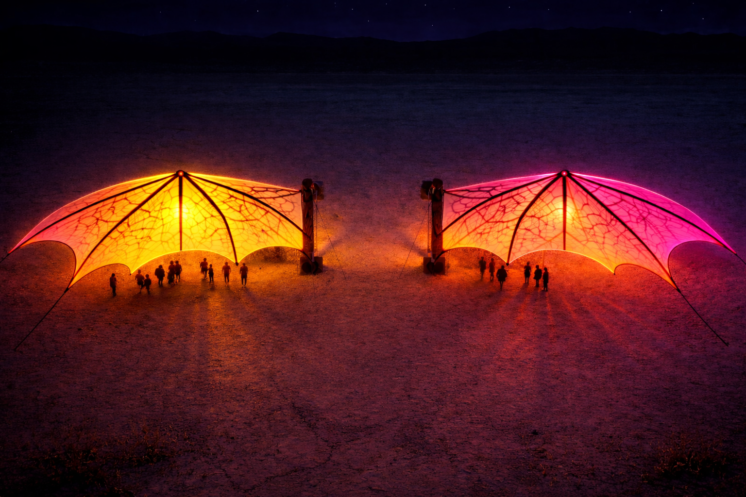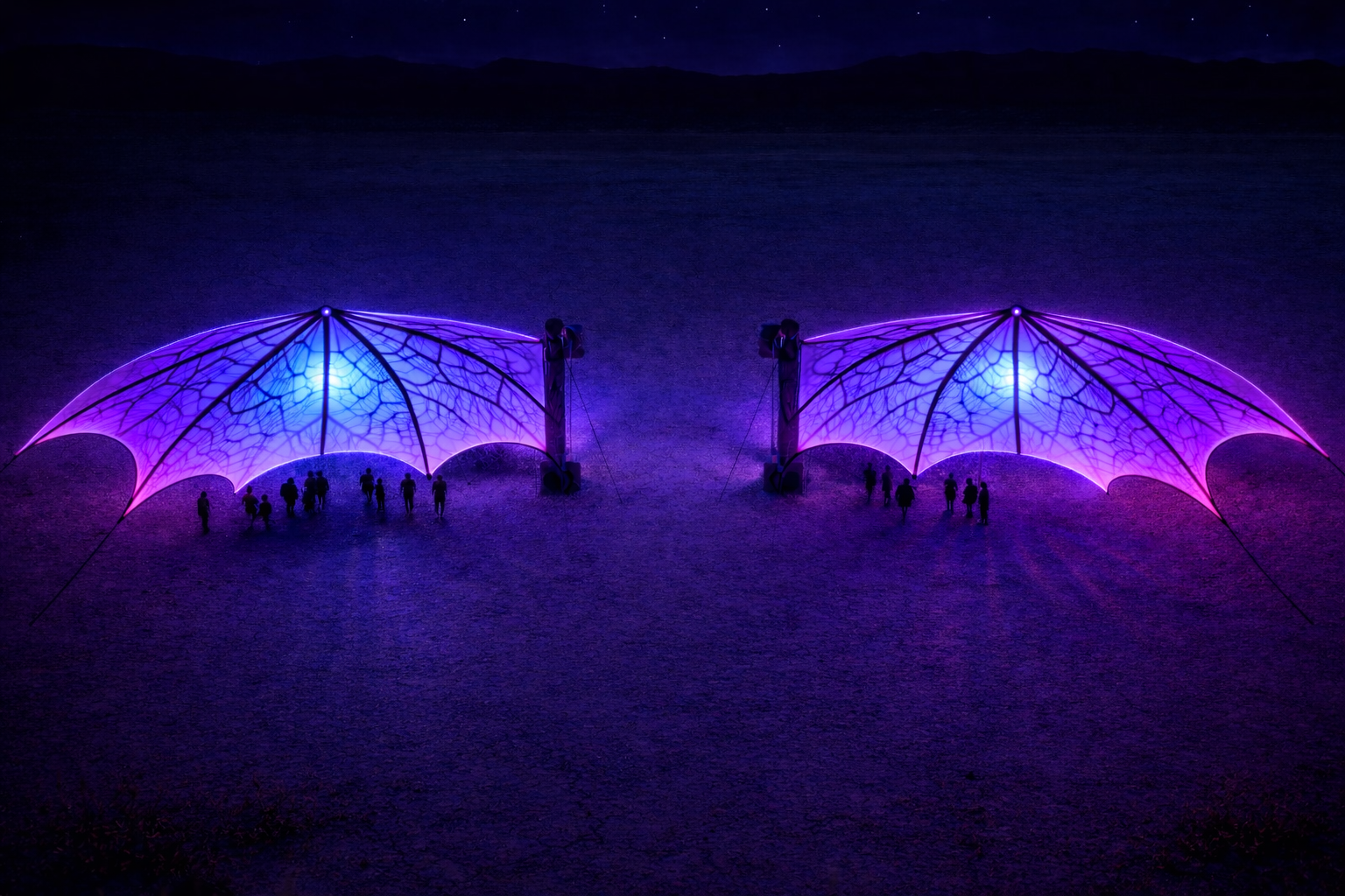 At night, approaching vehicles cause the wings to glow and extend, transforming passage into a living gateway shaped by the memory of trees.