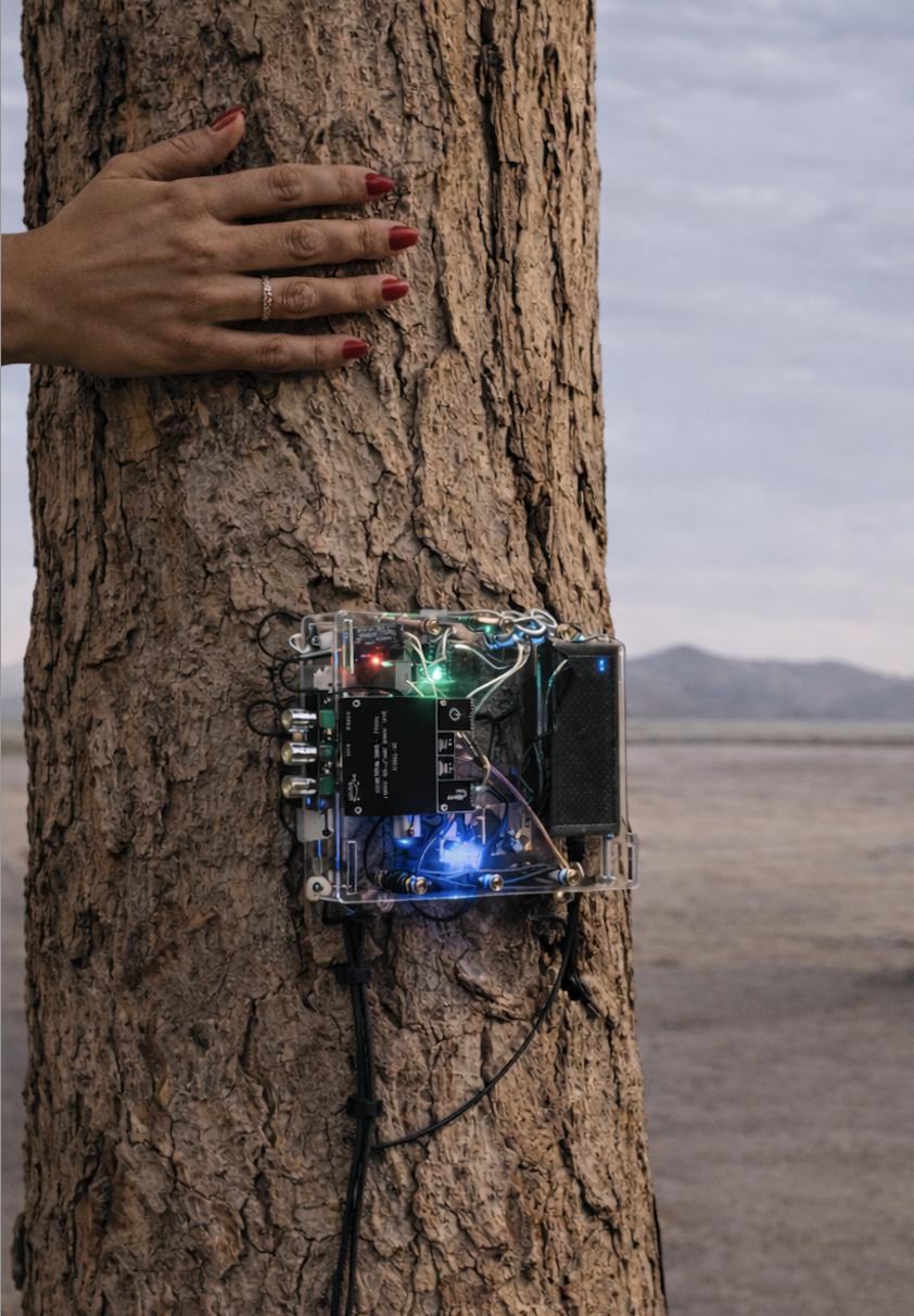 Whispering Forest is an ongoing project sourcing trees from around the world - Azerbaijan, Georgia, Latvia, Italy, Germany - and reviving them through custom bone-conducting sound technology. It began with my late grandfather’s mulberry tree in Azerbaijan, connected to a living mulberry’s electrical signals. The work honors memory and reveals how trees endure through cooperation—offering a lesson to humanity, so often divided by conflict.