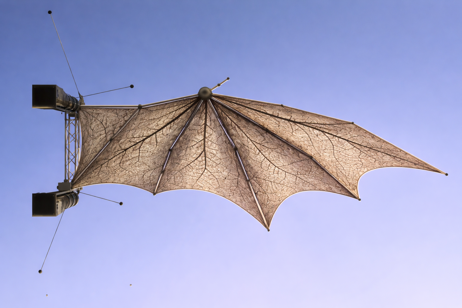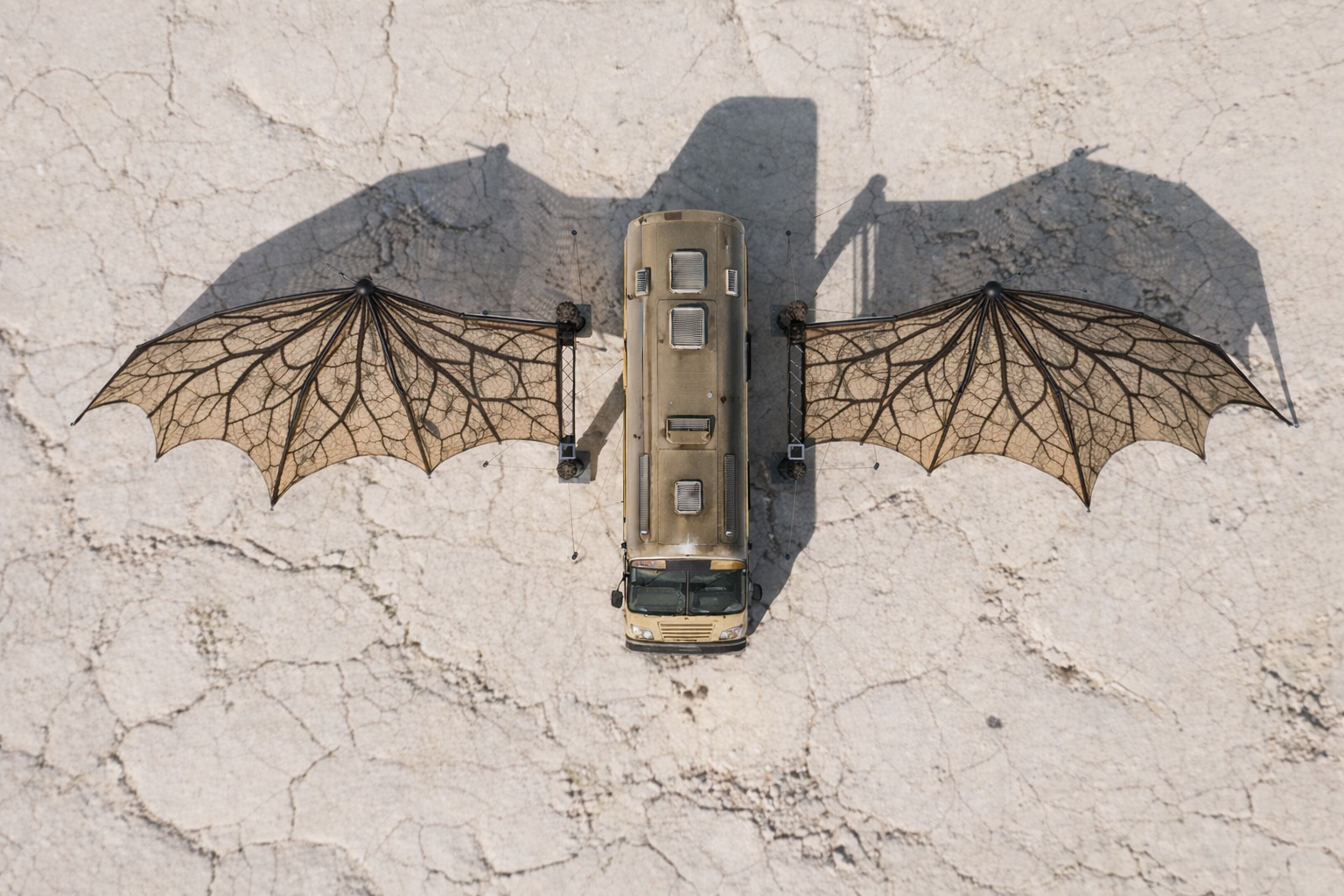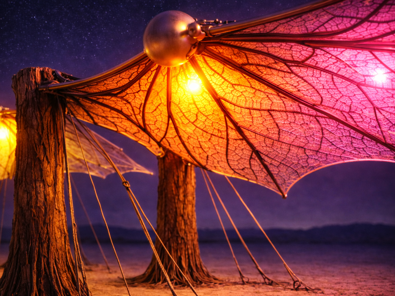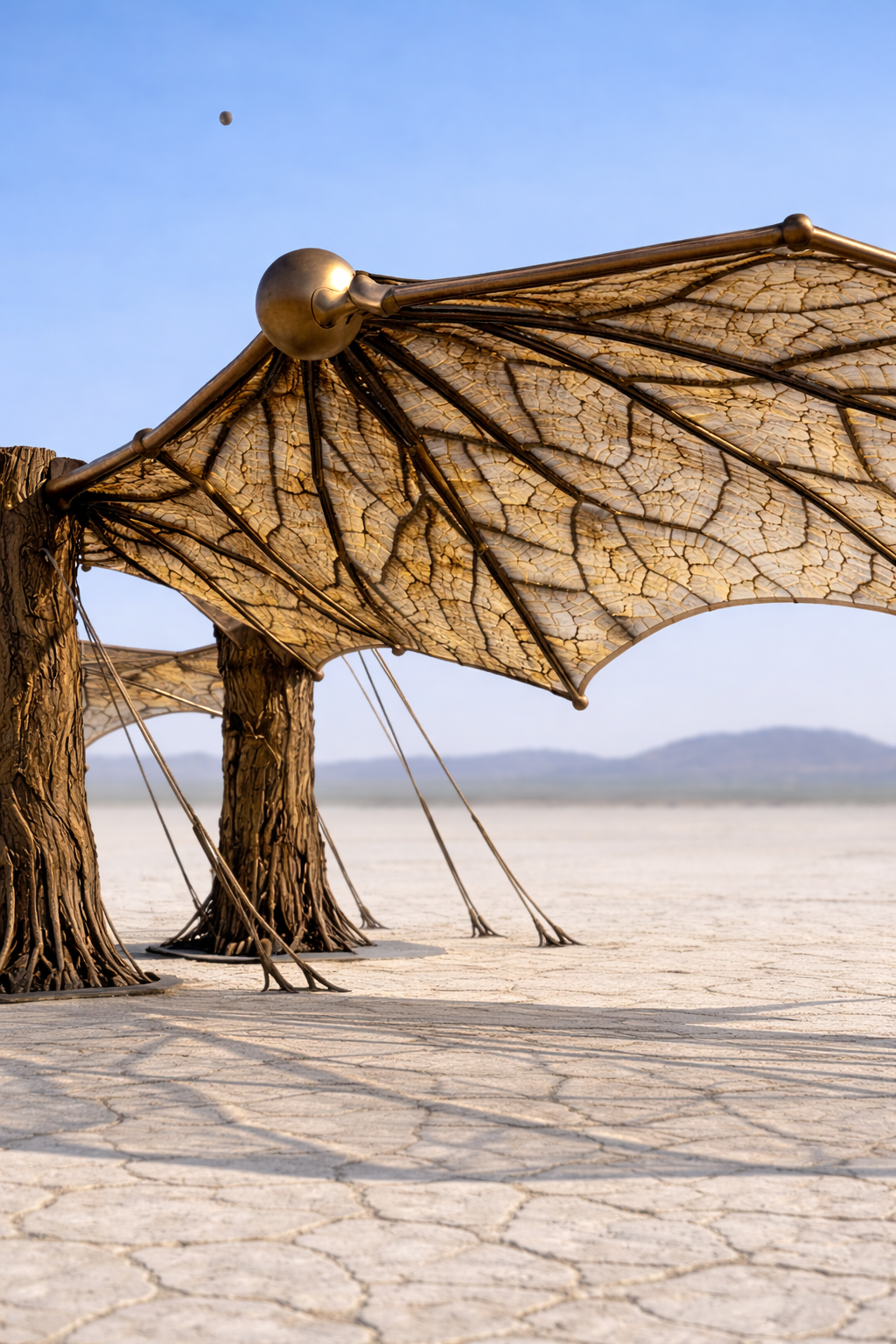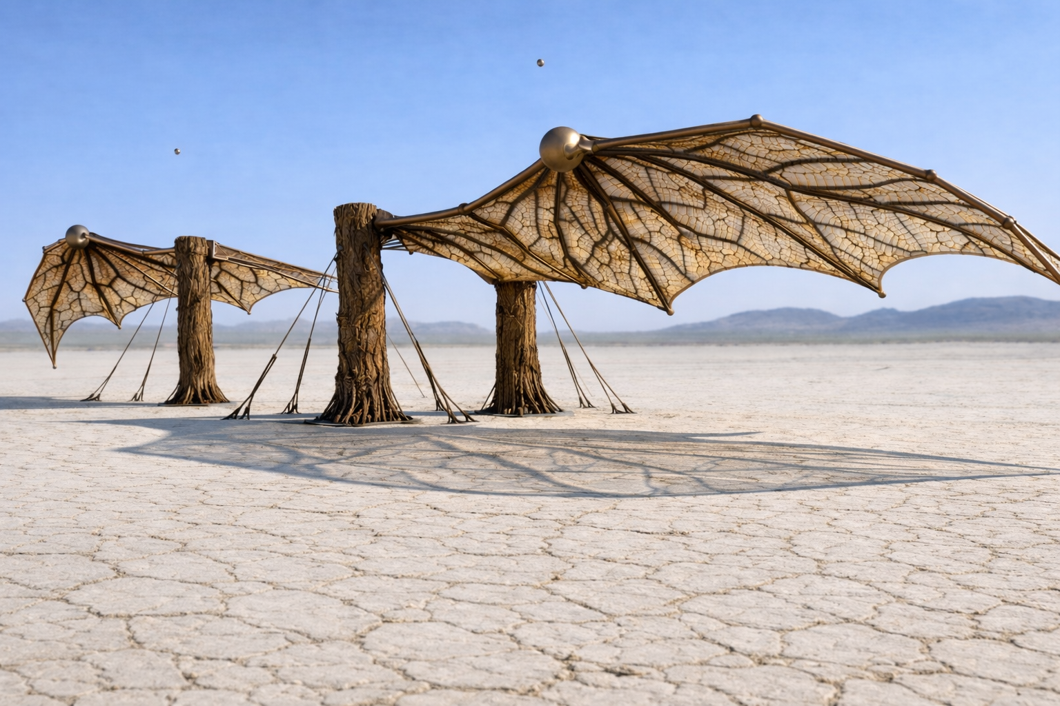 Grown in the desert, this giant bio-dock station from a new era consists of two elements - the Whispering Forest and the wings. The reclaimed trees beneath the wings act as memory vessels, data carried by trees—biological archives preserving patterns of growth and communication for millenia. They release vibrations—echoes of preserved plant intelligence that literally prints the flight canopy —which can be heard when tree embraced.