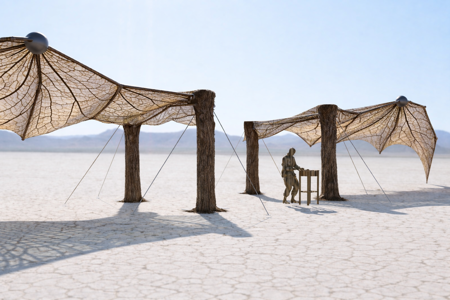 Whispering Forest is a site-specific installation composed of reclaimed, once-lifeless trees—remnants of ecosystems under strain—revived through breathlike whispers of custom sound technology. As participants wander between the trunks, these fallen giants murmur with the fragile pulse of resilience and renewal, transforming the vast openness of the Black Rock Desert into a sanctuary of listening. In their presence, even the wind seems to pause, inviting a contemplative encounter with what remains, and what could still be saved.